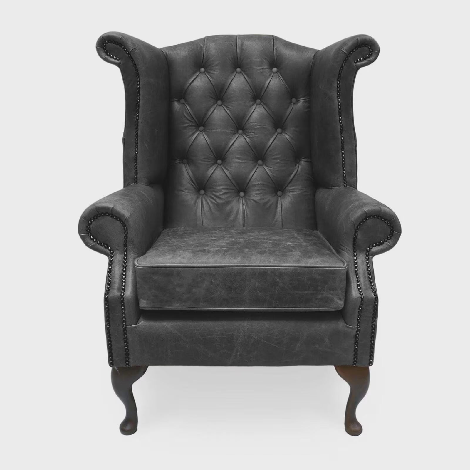 The iconic Queen Anne silhouette features a high, winged back and elegantly curved arms, creating a supportive and cocooning seat—perfect for relaxing with a book, unwinding in the evening, or entertaining guests. Upholstered in premium leather, this chair offers a rich, refined finish that only improves with age, adding character and depth to your space over time.